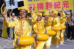 腰鼓队雄姿焕发,神气活现,令人耳目一新;深具传统特色的金黄色服装与腰鼓格外亮丽耀眼;队伍中有年长的银发族,也有快乐的小朋友,男男女女、老老少少。整齐划一的步伐,和谐的音韵与节奏,把法轮大法的美好与“真善忍”的种子,散播在香港街道上,深深撼动着驻足观赏的民众。