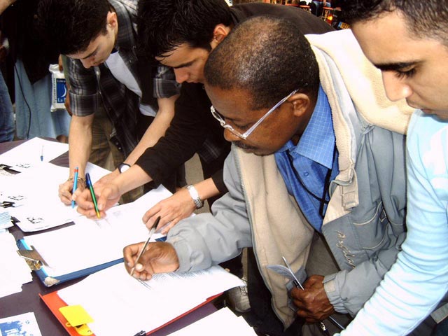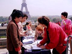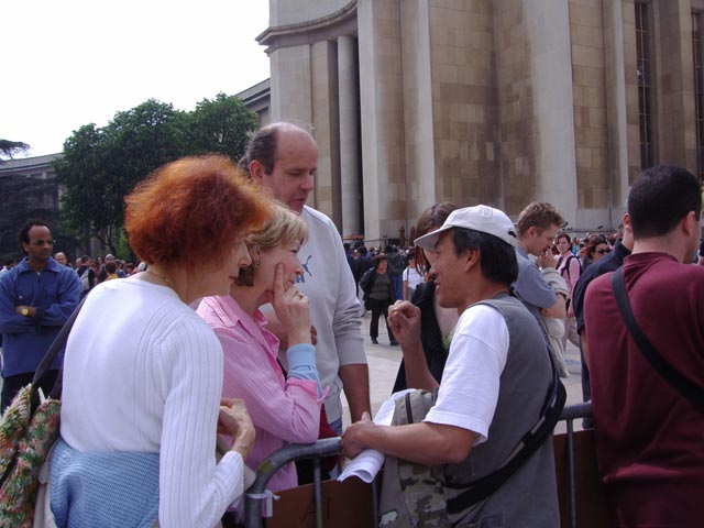 法国民众听到法轮功学员用高音喇叭揭露中共集中营罪恶、营救法轮功学员的呼声,看到酷刑展板图片,对发生在现今中国劳教所、集中营的罪恶行径感到愤慨、不能容忍。不同阶层的法国民众用不同的方式表达着他们正义之声——签名、拿征签和真相资料给他们的朋友,有的给法轮功学员买来水果表示他们的支持和同情。也有法国著名的专门著述关于中国问题的作家签名后表示将再与法轮功学员联系。还有法国的议员Bruno Villecourt在给希拉克的请愿书上签名后,留下名片希望法轮功学员一起寄给总统希拉克。