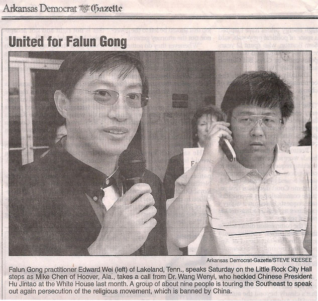 美中南法轮功修炼者的汽车之旅将穿过中南部四个州,大约十六个城市,持续十天左右。他们在五月六日下午抵达阿肯色州首府小石城,于下午两点在市政府前召开新闻发布会。小石城两家电视台及一家报纸到场采访。