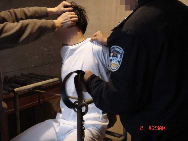 恶警还用一个木棍的一端插在肛门上然后另一端卡在椅背底部的横梁上,再用电棍电击肛门,使雷明更加苦不堪言。