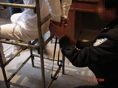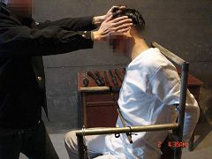 恶警们把雷明架到车上,劫持到长春市公安局。接着又把雷明架到大约六层楼的一个房间里,将他绑在老虎椅上。铁老虎椅比一般椅子高很多,得有人抬才能坐上去。坐上之后双脚离地,然后将双脚固定到椅子腿上。再用一根铁棍(同大门的门闩相似)紧紧贴着小腹,横穿在两扶手内侧的孔上。再用锁头锁上,双手反背铐在椅背上。一恶警拿着带尖的电棍在雷明脖子后面猛电了数下。(图为法轮功学员重组酷刑演示)