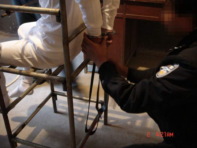 雷明在这里呆了两天,然后恶警们又把他劫持到一个宾馆里,铁老虎椅子一直随行带着,在宾馆又呆了两天雷明一直在铁椅子上呆了四天四夜。最后恶警们对他进行各种残酷迫害后,又把雷明送到铁北看守所。