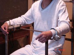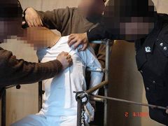 大概过了四、五个小时,雷明的胳膊,手腕骨被抻的、硌的如同被刚扣上一样痛苦,汗水好象流干了似的,身上的衣服早已湿透。雷明的手腕还在用力往上拽,终于牛皮带被雷明挣断了。恶警们想再扣上,可是怎么也扣不上,一个恶警抓住雷明反背铐的双手,使劲往上抬,使雷明的前胸和大腿紧贴在一起,雷明小腹被铁棍硌的十分痛苦,这个姿势大约过了五分钟才停手。这时恶警们又找来一根绳,准备用绳子固定他,但是怎么也固定不紧,没有别的办法,只好把手铐打开往扶手上的手铐上铐。由于双手被强力拉抻,雷明右胳膊已经脱节了,右小臂呈紫黑色,象残废了一样悠荡着,双手肿的象馒头一样,手指粗了二、三倍。