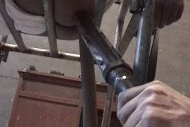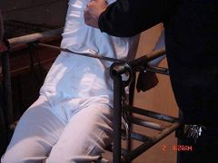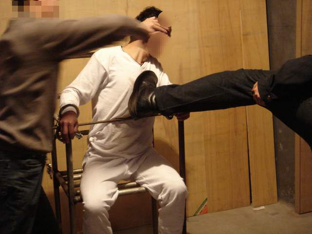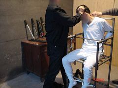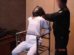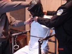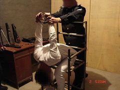 恶警们把雷明拽下车拖到一个房间里,房间里摆放着铁老虎椅、电棍、塑料袋、大铁桶、电炉子……从房间的简单装潢看,好象是一个酒店的包房,而且比较陈旧,没有暖气,好象早已不经营了。恶警把雷明抬到铁老虎椅上,然后用根细绳把雷明的双脚绑紧,而后用铁棍(同市公安局的那个一样)在扶手底下的孔上,紧贴在小腹处穿过,用锁头锁上。紧接着又给雷明用了更狠毒的一招,将他双手反背着,两腋窝卡在椅背上,然后用一条牛皮带从手铐中间穿过,经椅子腿的横穿上绕上来,两恶警恶狠狠的使劲地往下拉牛皮带,企图将牛皮带拉到最紧的程度扣上。由于手铐的铁环硌在腕骨上,胳膊筋也被抻着,致使雷明疼痛难忍,雷明用尽全身力量拼命反抗,恶警们没有得逞。其中一个气急败坏的恶警用脚猛踹手铐,才将牛皮带扣到极限,当时雷明痛的几乎昏了过去,汗水湿透了全身,那种痛苦真是难以言表。此时雷明的身体已丝毫不能动了。