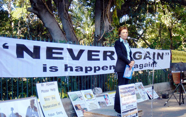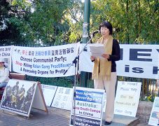 自由中国协会发言人Emmy女士发言中表示:中共大量活体摘取法轮功学员器官的滔天罪行,应该受到全世界人民的强烈谴责。她并指出:现在中共每天都在杀人,如果我们面对中共这种恶行视而不见,保持沉默的话,那是人类的耻辱!她更呼吁澳洲政府不要为了经济利益而忽视人权。