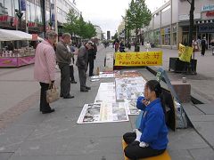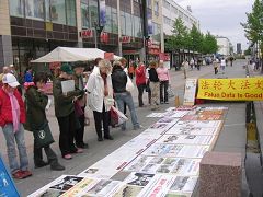 法轮功学员们用图片展示和散发真相资料的方式向民众揭露中共政权对法轮功残酷迫害的真相,特别是揭露中共在劳教所、集中营、监狱及医院活体盗取法轮功学员的器官,牟取暴利,焚尸灭迹的罪行。此灭绝人性的暴行激起当地善良民众的愤慨和对法轮功学员的同情,好几位妇女看后都流了泪。人们踊跃接受学员散发的真相资料并纷纷签名反对迫害法轮功。
