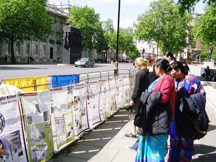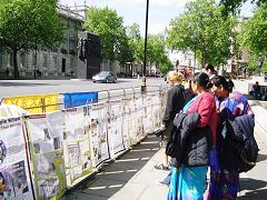 图片展曝光了中共对善良法轮功学员的残酷群体灭绝迫害,及中共活摘法轮功学员人体器官牟利,并毁尸灭迹的暴行。中共的邪恶使人们震惊,震惊之余,人们在思考,许多人在征签表上签下名字,表达对法轮功学员的道义支持和对中共暴行的谴责,签名的人中有行政人员、军官、警察、律师、医生、学生……,还有各国的游客和中国人。