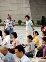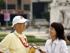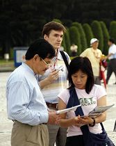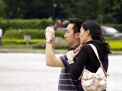一对来自香港的情侣很认真的在录像,他们说知道法轮功,但是没看过这么多人一起炼功。还有几位经过的年轻人说,喔!是法轮功耶,就拿出手机拍了起来。几个年轻的女孩则是对“法轮大法好”的横幅特别感到兴趣,她们轮流在横幅前面留影。