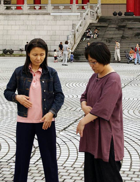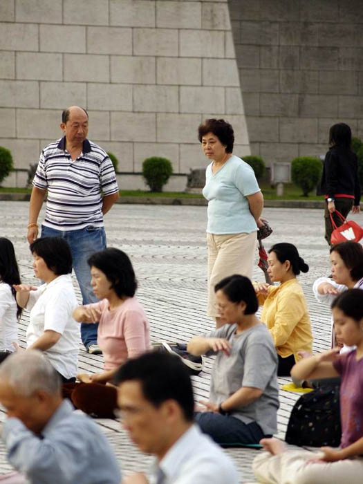 天公作美,民众纷纷抓紧这难得的机会结伴出游,当天中正纪念堂游客络绎不绝。当人们穿过“大中至正”牌楼后,立即被广场上两幅黄色醒目的“法轮大法好”及“法轮大法 真善忍”的大横幅所吸引。走近,一群或老或少的男女法轮功学员祥和的伴随着音乐,缓、慢、圆的炼功画面,让经过的游客们不由自主的举起照象机不停拍照。