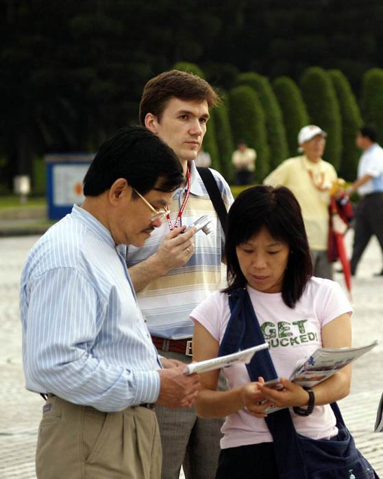 许多中外游客一面看着法轮功学员宁静安详的展示功法,一面听着发简介的学员揭露中共活剖法轮功学员器官盗卖牟利的恶行,他们都非常震惊,并说非常不理解,中共为什么对这么一个平和的信仰团体这么残酷的迫害。一位来台探亲的英国太太说她不喜欢中共,她要把《九评共产党》拿回去给她家一位大陆留学生看,让他也认识共产党邪恶的本质;另一位在中国大陆有亲戚的老伯伯听学员说,目前已有一千一百万中国民众因为看了《九评》而退出中共恶党及相关组织,他跟学员要了一本《九评》,说要好好看看再给他亲戚打电话劝说。