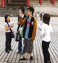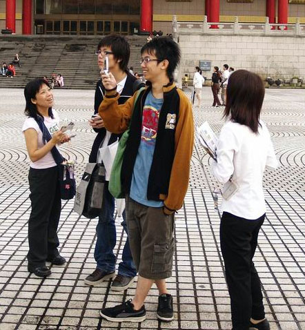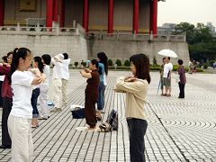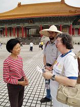 【明慧网2006年6月12日】(明慧记者周容台北报导)台北连日豪雨,2006年6月10日下午,好不容易天放晴了,台北十大区的法轮功学员为了让民众知道法轮大法的美好,特别利用周末在台北热门景点──中正纪念堂举行每月的炼功洪法活动。