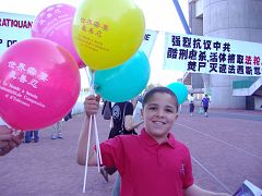 法轮功学员的展位设在一个入口处,等待进场的观众排成了长队,西方学员们用高音喇叭不停的向人们讲述着法轮功在中国受到的迫害,善良而正义的人们纷纷地从队伍中走出来为呼吁制止迫害签名。一群中国人也在排队入场,中国学员就用高音喇叭向他们宣读 《九评共产党》,这些中国人都静静的听着直到入场。