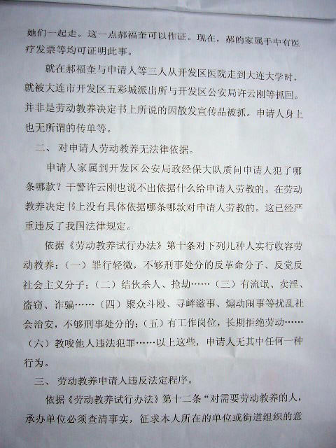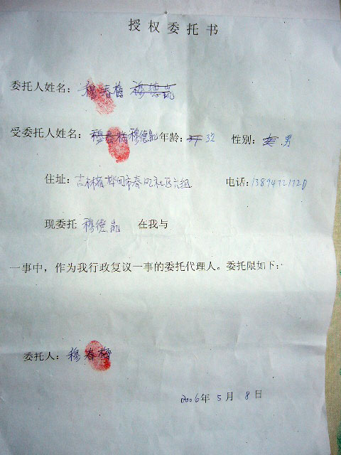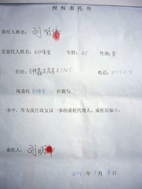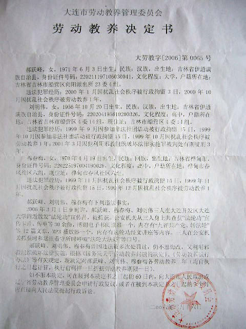 ![]() 穆春梅的授权委托书 | ![]() 刘明伟的授权委托书 | ![]() 非法劳动教养决定书 |