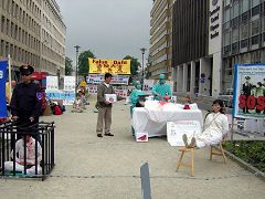 还有一些学员在做炼功功法演示。整个活动平和肃穆、秩序井然。众多胸前佩戴标志参加欧盟高峰会议活动的人们和行人,在经过活动场地时都在听着、看着、阅读着中共对法轮功学员迫害的真相。其中一位女士不敢相信自己所听、所看,走向法轮功学员询问:“这一切只是演戏,不是真实的发生,是吗?”当学员告诉她这一切实实在在的发生在中国,并持续了近七年后,她震惊的表示必须制止这个罪恶。有的行人还询问学员何时举办下一次活动。
