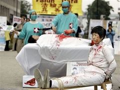 美联社6月15日刊登摄影记者Yves Logghe拍摄的法轮功学员抗议的照片,图片显示法轮功学员当时正在模拟中共活体摘取法轮功学员器官的行径。