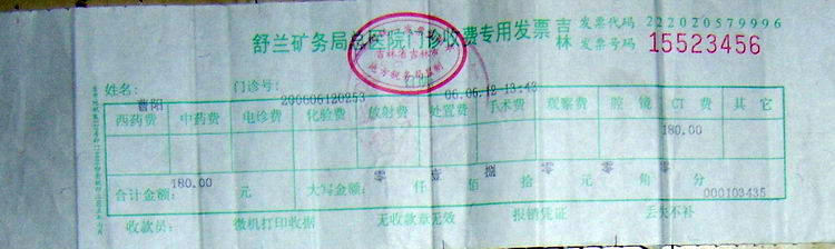 ![]() 男孩被陈新柱打坏后,家人领孩子到医院看伤的收据 |