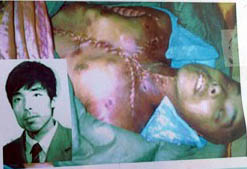 法轮功学员王斌,44岁,黑龙江省大庆油田勘探开发研究院计算站软件室工程师,于2000年9月24日被大庆男子劳教所恶警冯喜等毒打致死。被打死后内脏被野蛮摘除,遗体被放在大庆人民医院太平间里,心脏、大脑被剖出。图为王斌伤痕累累的遗体。