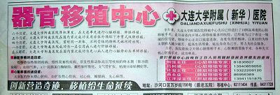 2005年7月14日,大连《新商报》18版“中国新闻”上刊登了大连新华医院(大连大学附属医院)的器官移植广告,见下图: