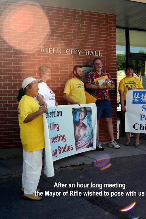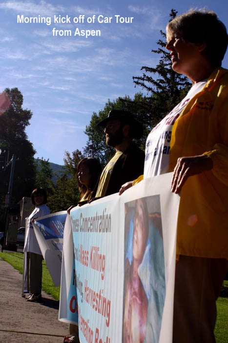 【明慧网2006年6月20日】自今年4月科罗拉多州议会两党一致通过“谴责中共迫害法轮功”的决议案后,为了进一步揭露发生在中国的、中共对法轮功学员的残酷迫害,美国西部地区法轮功学员组织了为期七天的汽车之旅。车队于2006年6月10日在艾斯本市(City of Aspen)起程,最后于6月17日到达格兰乌德-温泉市(City of Glenwood Springs);途经科罗拉多山区及西部的40个城镇;所到之处,学员们将法轮功真相带给了众多市长、市政府官员、当地媒体及图书馆。