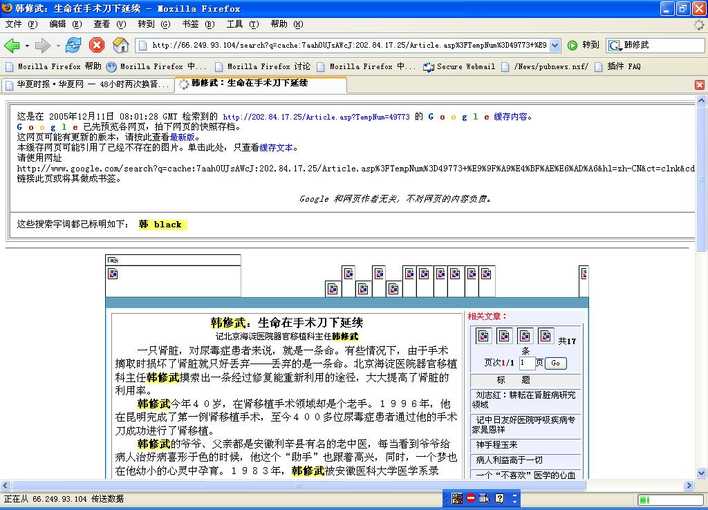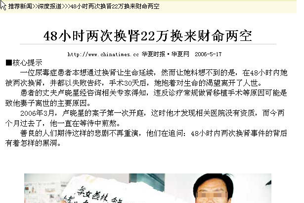 2006年5月17日中共《华夏时报》第1562期报道一篇题为“48小时两次换肾 22万换来财命两空”的文章,以一整版的内容,报道安徽阜阳人卢晓星的妻子薛燕林于2004年12月19日至2005年1月30日期间住在海淀医院移植中心,历经48小时两次换肾的遭遇。薛燕林手术30天后,含泪离世。