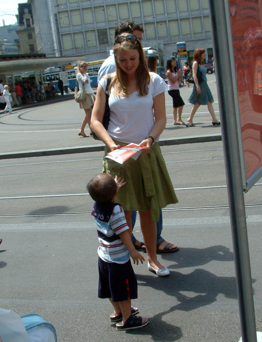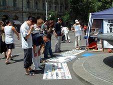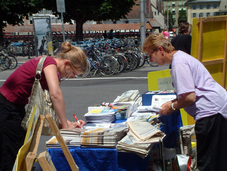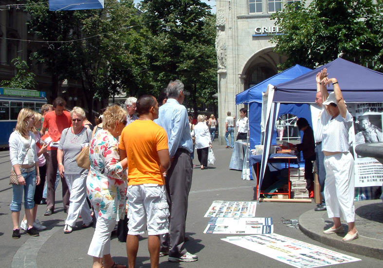 2006年6月17日,在国际都市苏黎世的市中心Parade广场,法轮功学员又一次举行了信息日。学员们展示的5套优美缓慢的功法吸引了很多路人驻足观看。但随之映入眼帘的是功法展示旁的醒目横幅——“中共活体摘取法轮功学员的器官”,以及一幅幅触目惊心的揭露迫害的照片。