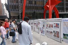 ![]() 集会现场,人们观看真相图片 | ![]() 法轮功学员向民众讲述中共活盗器官的罪恶 |