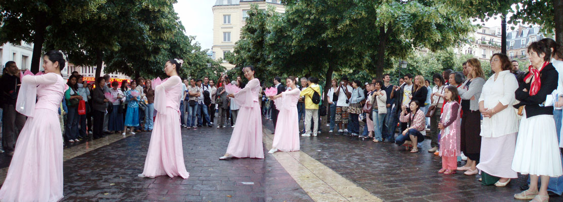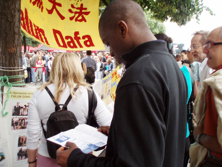 巴黎法轮功学员代表向观众介绍道:“今天我们为大家奉献多彩的中国传统节目,这些节目都是由法轮功学员创作表演的。”他向观众们介绍了什么是法轮功以及法轮功学员在中国正在遭受着野蛮的残酷迫害,呼吁大家声援法轮功。学员还用展板展示法轮大法的洪传和中共对法轮功学员的残酷迫害,游人看后纷纷表示声援法轮功学员,谴责中共的迫害。
