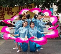 广场上有多个团体的活动,然而嘈杂声丝毫不减观众的兴致,观众们兴致勃勃的欣赏着法轮功学员的精彩表演,喝彩声和掌声此起彼伏。许多人不断的拍照,纪录下一个个精彩的镜头。