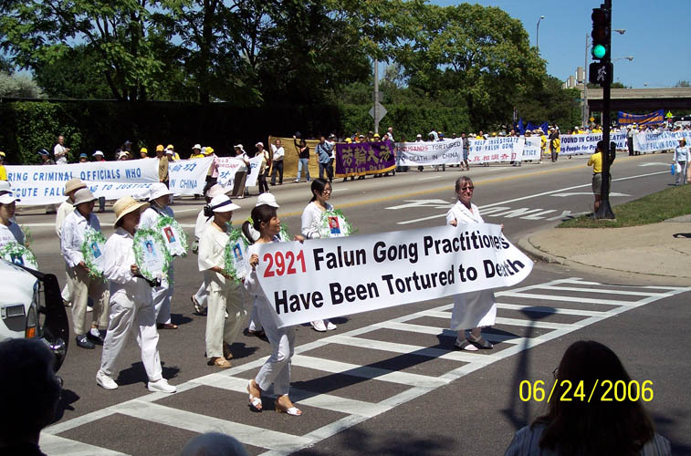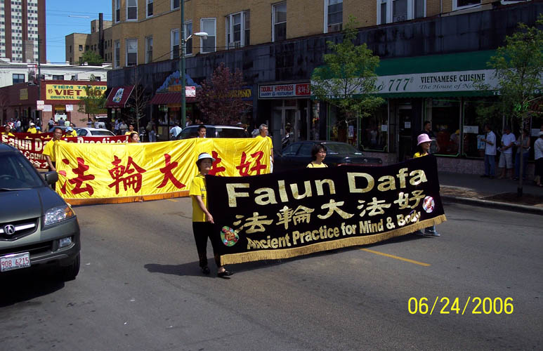 【明慧网2006年6月25日】(明慧记者徐菁芝加哥报道)六月宜人的气候让美国第三大城市芝加哥迎来了一年中的黄金时期,同时也迎来了千余名来自世界各地的法轮功学员。2006年6月23日,24日,法轮功学员来到芝加哥举行大型的洪法活动,并于24日在北中国城举行“法轮大法好”主题游行。