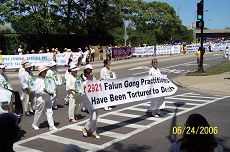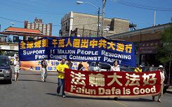 同时,主题游行还表达了诸多学员们的心声:“法轮大法好”,“世界需要真善忍”“法办江罗刘周,停止迫害法轮功”“公开调查劳教所活体摘取法轮功学员器官罪行”等等。特别是作为游行的最后一个方阵 – “全球声援1100万中国人退党”,更引起中国城里的人们思考。