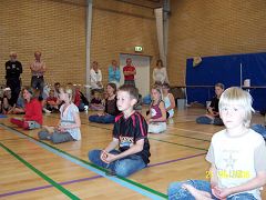 2006年6月21日,在丹麦的一个小城威堡的别尔格吾学校,随着优美的法轮功炼功音乐和师父的口令,孩子们盘腿打坐炼起第五套功法,原来喧哗的体操房一下子静了下来,就象在人事纷争的乱世,突然看到一片宁静的绿洲。