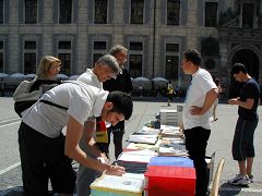 今天来讲真相的法轮功学员也用微笑迎接着前来过节的游客,同时把法轮功的被迫害真相,全球退党大潮的真相和法轮功学员被活体摘取器官的真相告诉人们,希望每个走过的人在知道了真相之后,能萌生善念,从而拥有美好的未来。很多游客在征集支持停止迫害法轮功的签名表上写下了自己的名字。