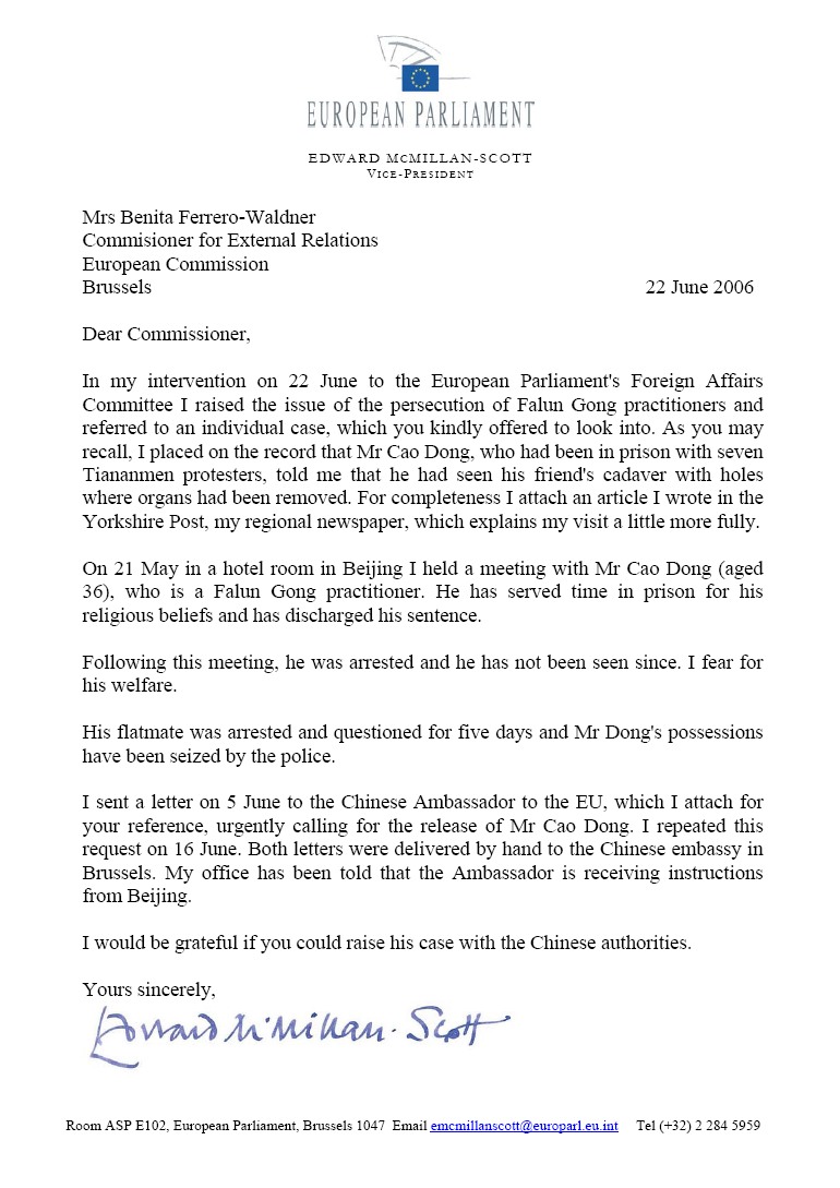 在我6月22日参加欧洲议会外交事务委员会会议讨论中,我提出了(中共)对法轮功修炼者迫害的问题及一个有关的个人案件,你诚挚地答应会关注调查此事。你应该还记得,我提出并列入会议记录有关曹东先生的事情,他曾经与七位上天安门请愿者一起被关押,他告诉我他曾经看到他朋友的尸体上因器官被摘取后而留下的洞。
