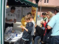 有几个青少年一开始站在远处取笑学员,但当他们走近展位,看了法轮功介绍和揭露中共迫害的海报后,他们严肃起来,主动在呼吁书上签了名。