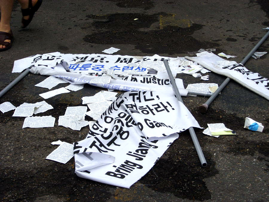 ![]() 躲入中领馆的肇事者终被逮捕判罪 | ![]() 被肇事者撕毁的横幅 |
