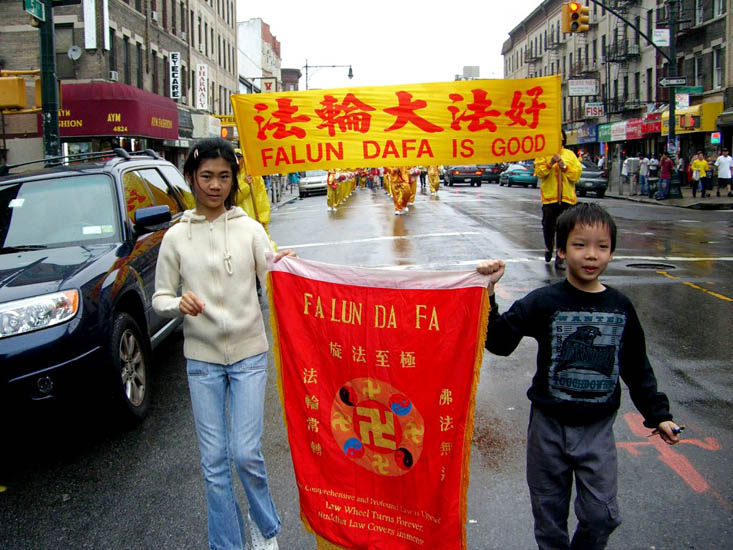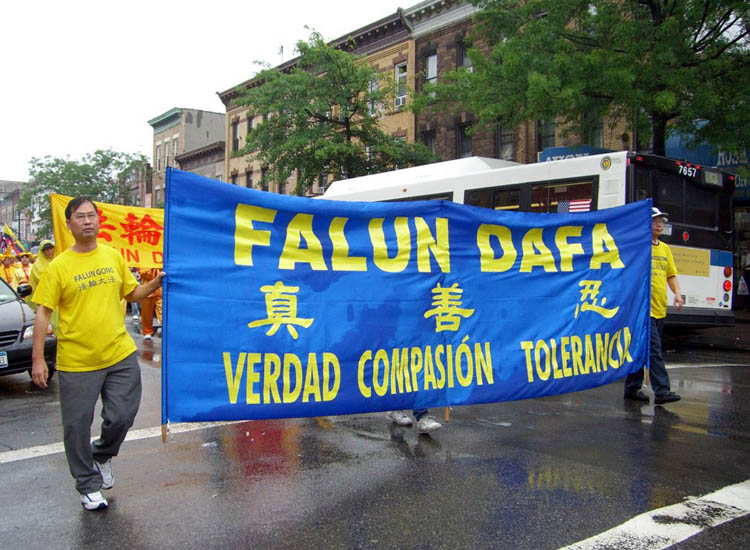 【明慧网2006年6月5日】(明慧记者采菊纽约报导)2006年6月3日的中午,在纽约布碌仑(brooklyn)西班牙社区的“旗帜”游行中,法轮功学员的腰鼓队再展风采,受到当地居民的欢迎。