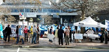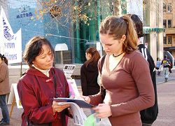 奥克兰的冬季多雨,而且风也很大,但这一天天气格外晴朗,广场上人来人往,活动吸引了很多人驻足观看。法轮功学员忙着发资料,讲真相,征集反迫害签名。