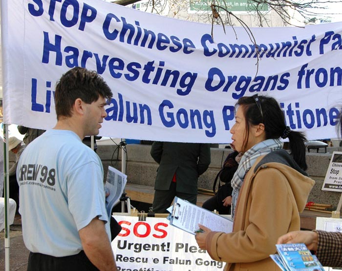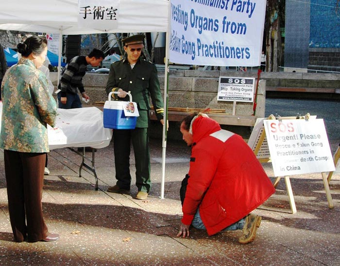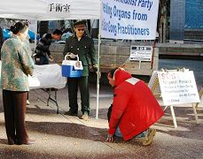 法轮功学员们给每一个路过的人讲真相。有一位男子在听了迫害真相后流下眼泪,并跪在了揭露中共活体摘卖法轮功学员器官的摹拟演示前为受害者祈祷。