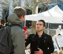 ![]() 一位了解了真相的男子跪地为遭受迫害的法轮功学员祈祷 | ![]() 法轮功学员接受采访 |