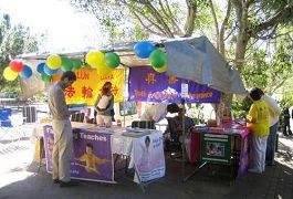 【明慧网2006年6月5日】2006年6月4日, 澳洲昆士兰法轮功学员们参加了阳光海岸举办的一年一度的世界环境日活动(World Environment Day)。这天,阳光明媚,刚刚进入冬天的昆省充满了温暖与希望。一整天,学员们不间断的展示着五套功法,过往行人无一不停在展位前了解真相,人们除了索取资料外,也都签名反对中共对法轮功的残酷迫害,谴责中共盗取法轮功学员活体器官的暴行。
