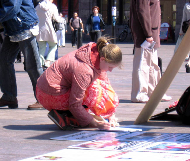 很多人认真的看了图片或真相资料后,立即前去签名声援反迫害。还有的主动找学员了解更多信息并询问怎么提供帮助。学员请他们将真相告诉更多的人。
