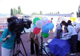 【明慧网2006年6月9日】在二零零六年世界杯足球赛举行之际, 6月7日晚上8点,法国队与中国队在法国中部城市圣•埃田(Saint Etienne)的基奥弗洛依•圭沙(Geoffroy- Guichard)体育场举行世界杯前的友谊赛。法国法轮功学员也到球赛现场,揭露中共7年来对法轮功学员的迫害。他们摆放了揭露中共迫害法轮功的真相图板、悬挂横幅,用高音喇叭向人们揭露中共在劳教所、集中营对法轮功学员的虐杀及活体摘取人体器官的罪行。法轮功学员做的“法轮大法好”、“世界需要真善忍”的五彩气球受到法国人的喜爱,他们觉得这是给他们带来好运的标志。了解了真相的人们纷纷签名支持法轮功,抗议中共暴政。法国电视3台也到现场拍摄并采访了法轮功学员。