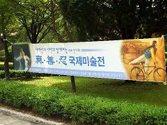 ![]() “真善 忍”美展的标语横幅。 | ![]() 校门外的真相图片及资料台 |