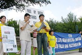 2006年7月8日下午,在人头攒动的加拿大蒙特利尔中国城,法轮功学员冒着烈日举行集会,响应加拿大独立调查员大卫•乔高和大卫•麦塔斯先生确认中共大范围实施摘取法轮功学员活体器官的调查报告,呼吁人们共同努力,结束中共对法轮功的迫害。