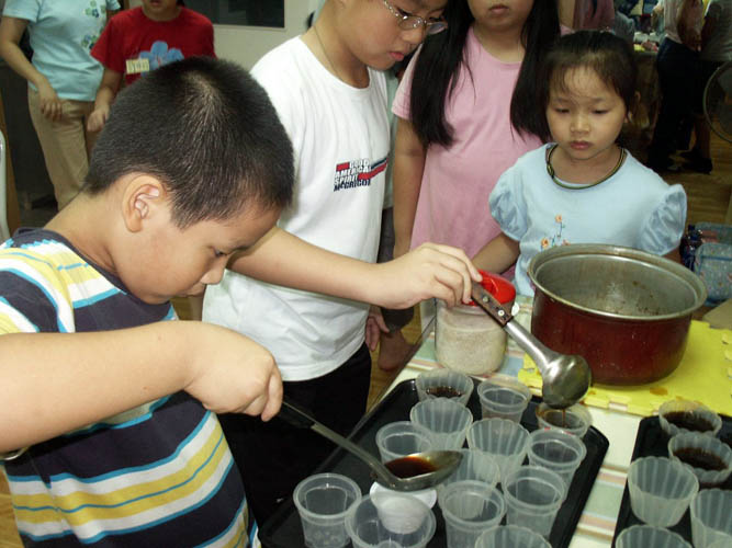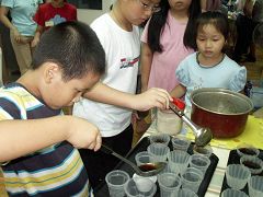 说到这两天最令人期待的点心时间,可全部都是DIY(自己动手)的哟!不但有烤饼干、巧克力、做松饼、果冻这些丰富多彩的成品。更重要的是,实际上这一整个DIY的过程也都是修炼!例如:当你想要搅拌巧克力,可是别人也想要做同一件工作时,那时小弟子就面临着能不能先他后我,轮流让他人也做做看的考验了。这几堂生活化又有趣的实践训练,可真是小弟子最真实的心性大考验呀!