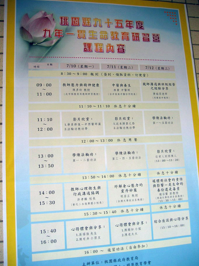 研习开幕当天,校长赖进麟先生及平镇市市长均莅临会场致词表示支持这个有益教师生命身心成长的活动。此外,7月10日当天活动内容丰富紧凑,有两场精彩的演讲、功法学炼、录影带欣赏、正法之路摄影展和法轮功学员分享修炼心得,让与会的老师感受到法轮功学员的用心安排及热诚服务。