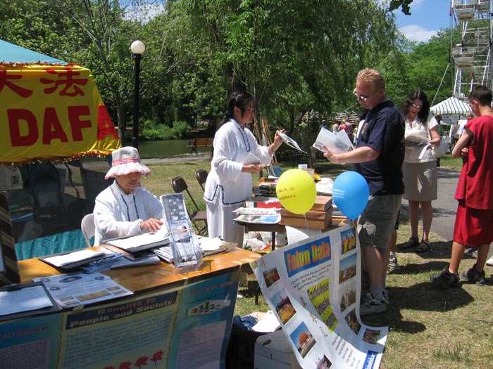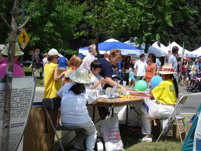 一位同丈夫带着一双儿女来参加多元文化节的加拿大女士,告诉学员她正要去中国大陆工作,对中共如此迫害法轮功这样一个和平的团体表示很不理解,很愿意了解更多关于中国大陆的真实情况,感谢学员们送给她包括《九评共产党》在内的所有真相资料,说在去中国之前会好好研究这些资料的。