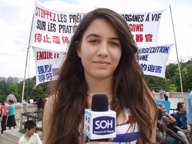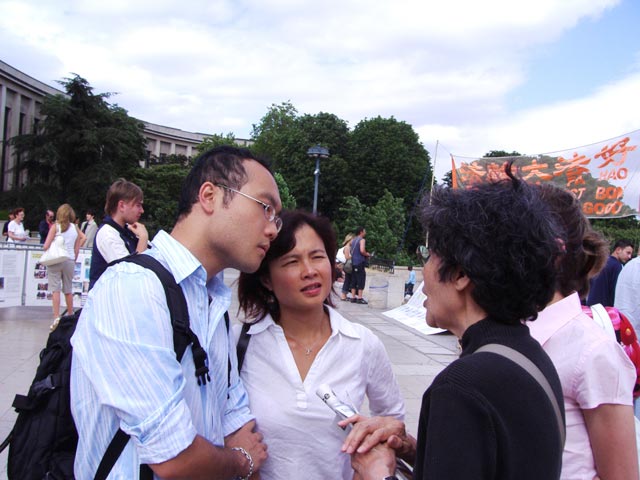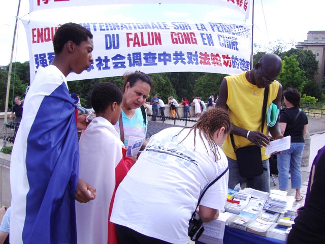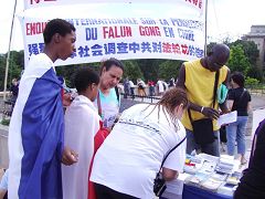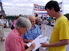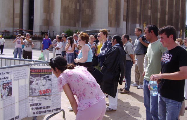 【明慧网2006年7月13日】2006年7月9日下午,在巴黎埃菲尔铁塔人权广场上,揭露中共活摘法轮功学员器官的黑幕,成为巴黎民众、世界各地游客们关注的焦点。对中共极力掩盖的残虐和对人类所犯下的罪行,人们表示,在21世纪的今天,还存在活体摘取器官、贩卖和屠杀,这是人类的耻辱。