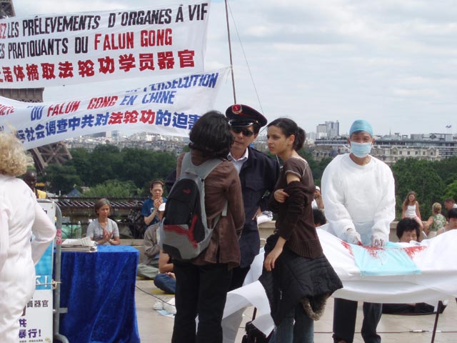 两位法国人看到活摘器官这一残忍的模拟场面,气愤的去质问模拟演示的“警察和医生”在做什么。扮演中共警察的那位法轮功学员向他们讲述了中共迫害法轮功的详细情况。