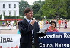 2006年7月14日中午,华盛顿DC部份法轮功学员在美国白宫附近的拉菲叶广场集会,紧急呼吁美国政府及国际社会立即采取行动,制止中共活体摘取法轮功学员器官的暴行,彻底结束已持续七年之久的对法轮功学员的残酷迫害。